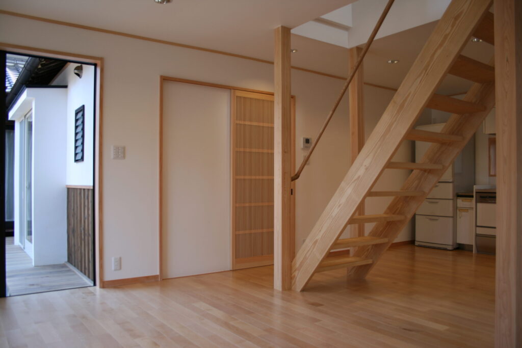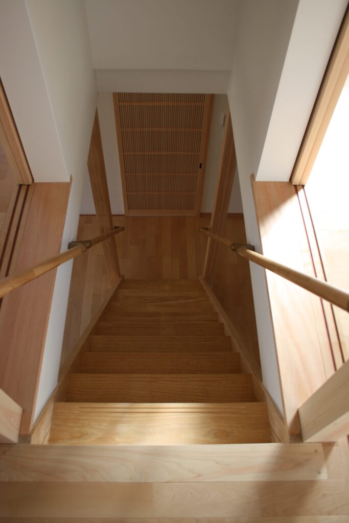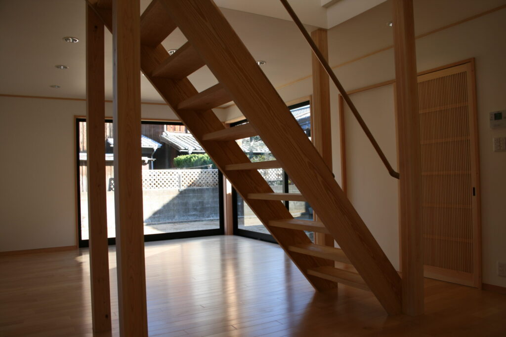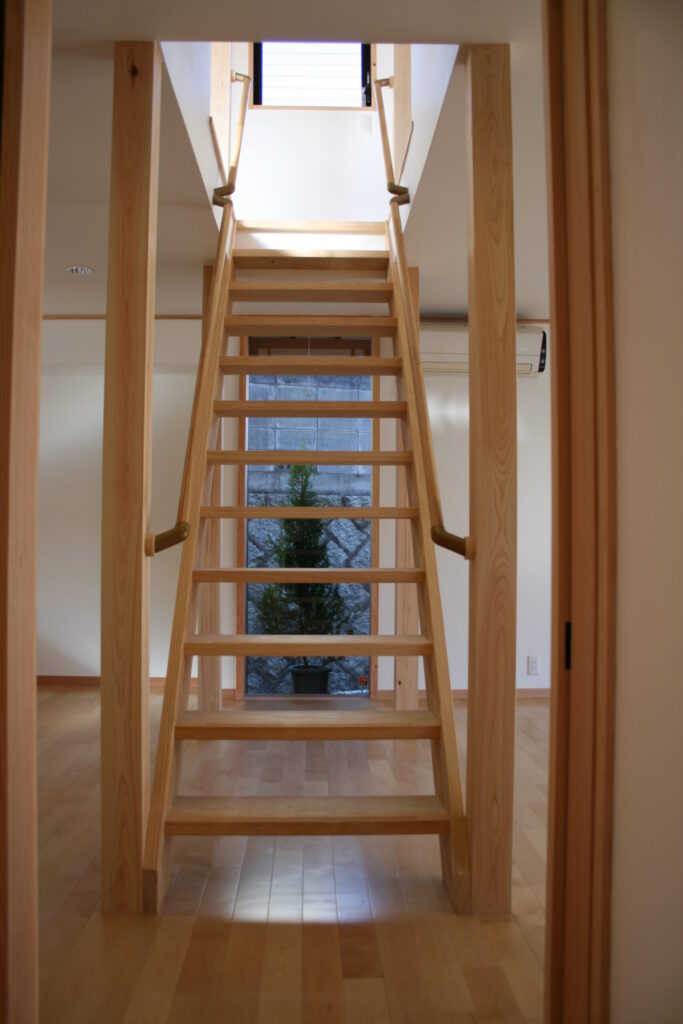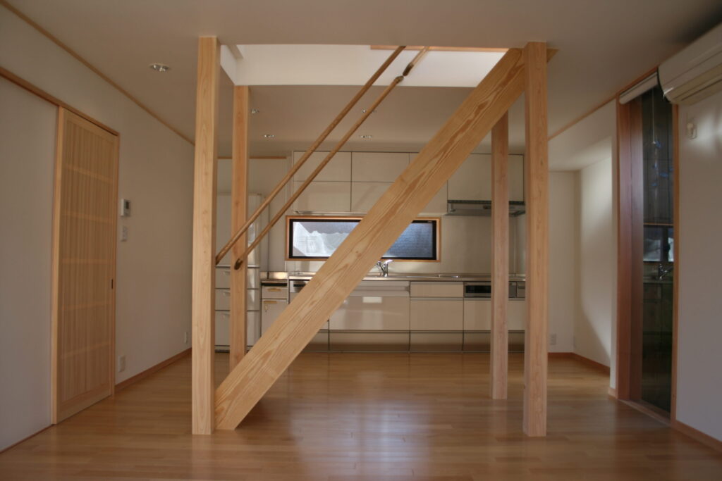 部屋の中央に設けられた、吹抜階段から明るい光が差し込み、スリット階段にすることにより、広々としたリビング、ダイニングとなりました。