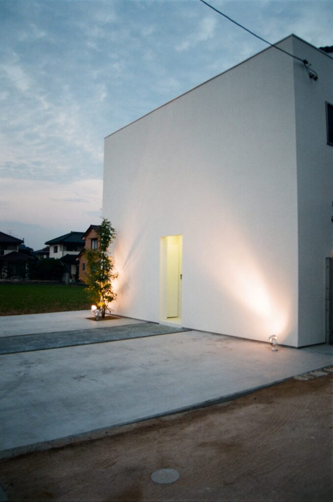 シンプルモダンな白い家を希望されました。正面から見ると白い壁が印象的です。