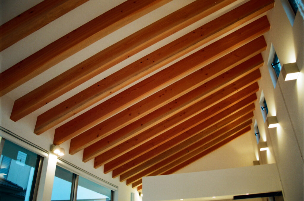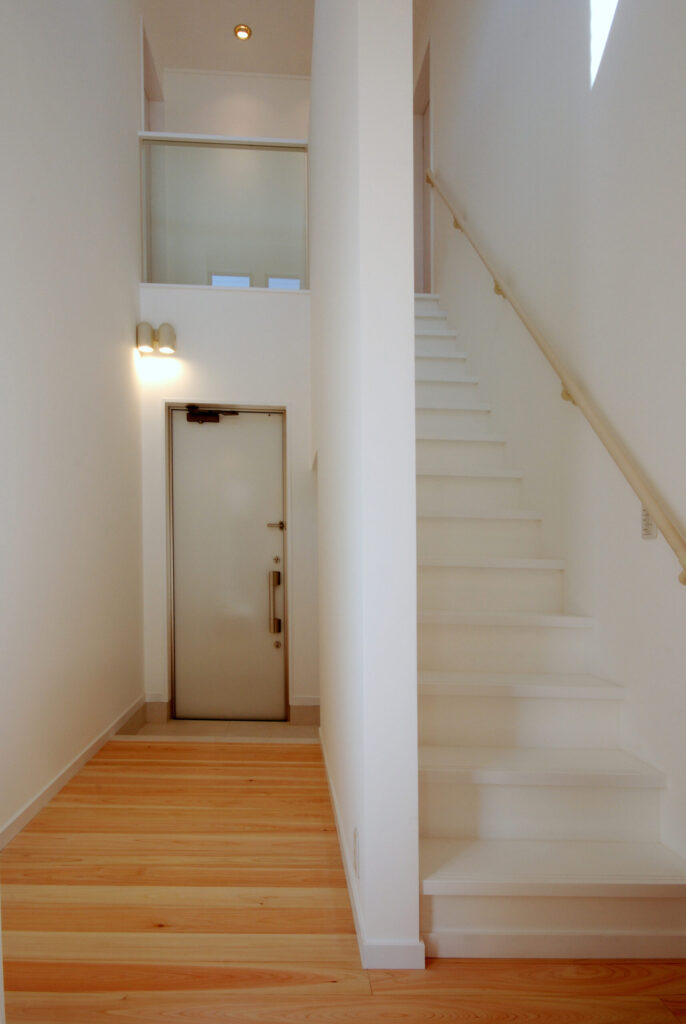 中庭側から、リビング吹抜上部の窓にむかって風の流れをつくり、南北通風を確保しました。