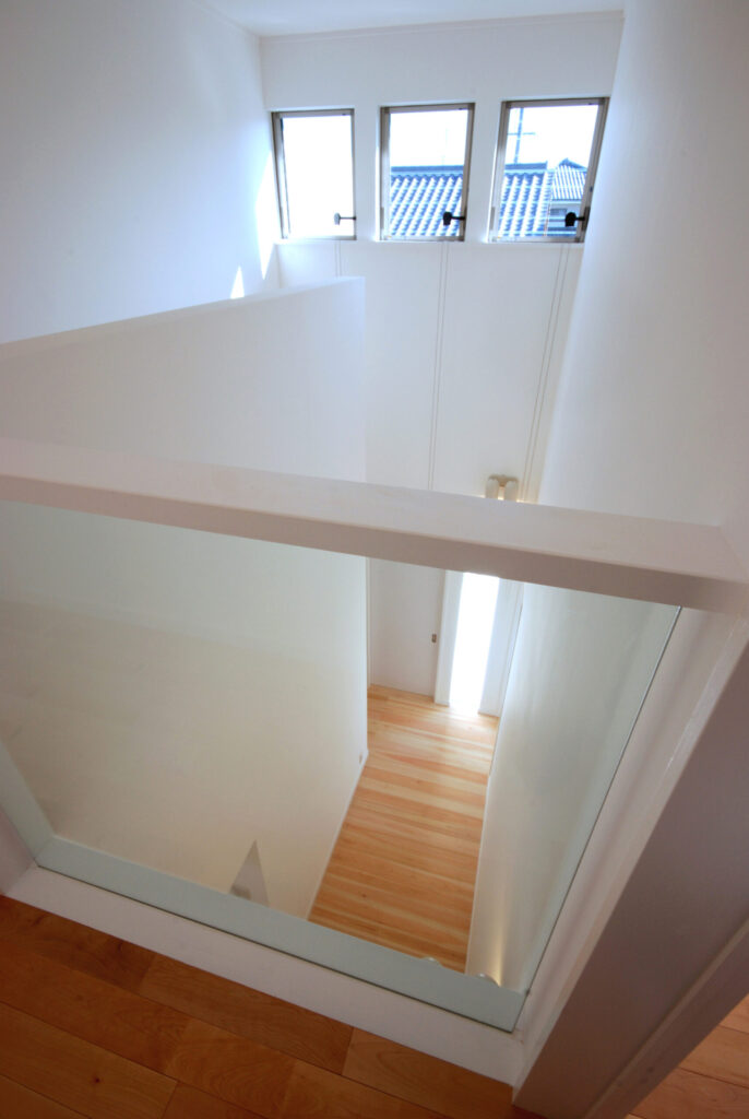 中庭側から、リビング吹抜上部の窓にむかって風の流れをつくり、南北通風を確保しました。