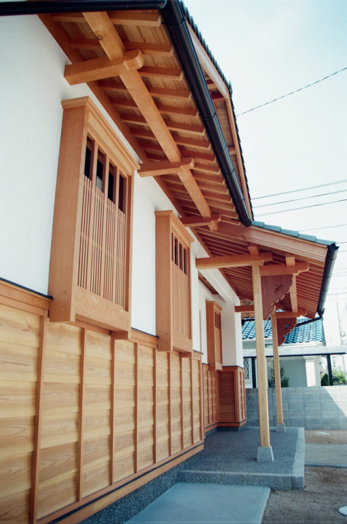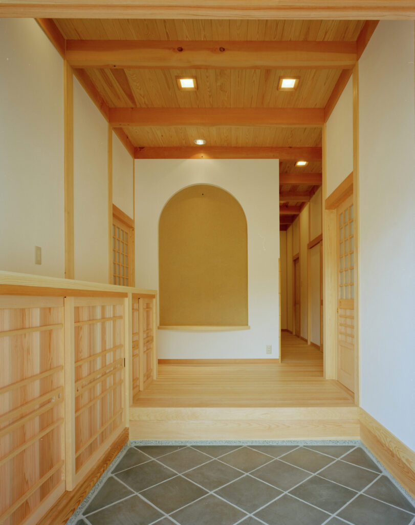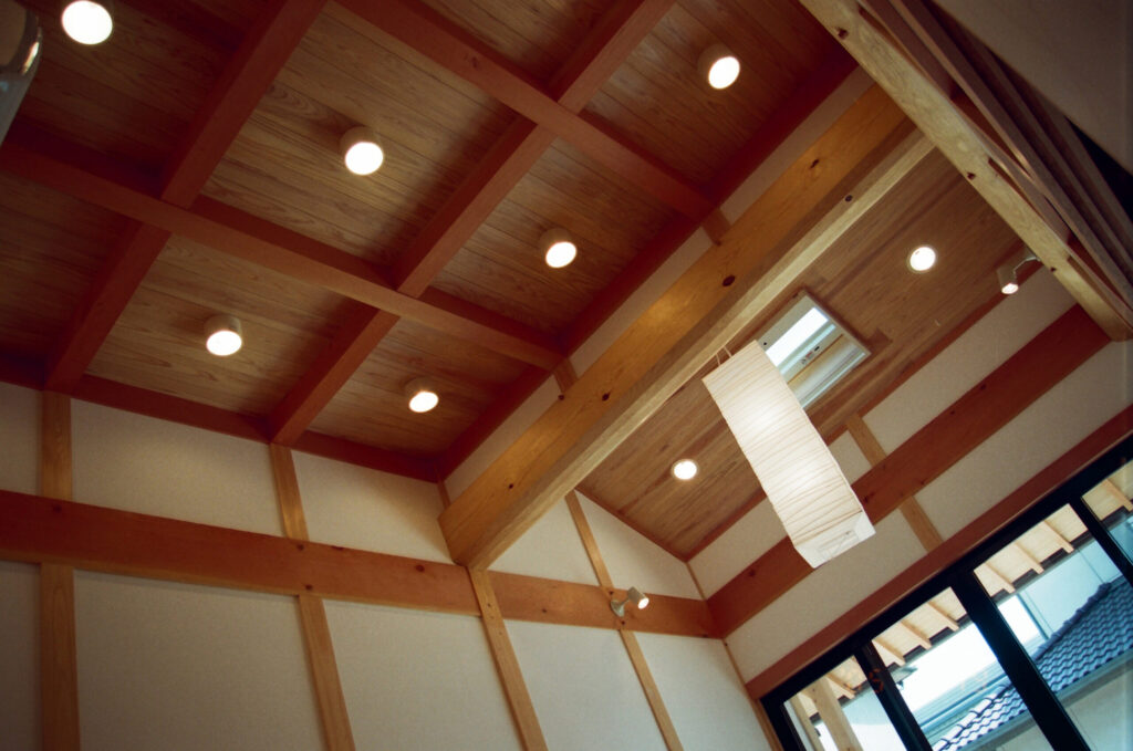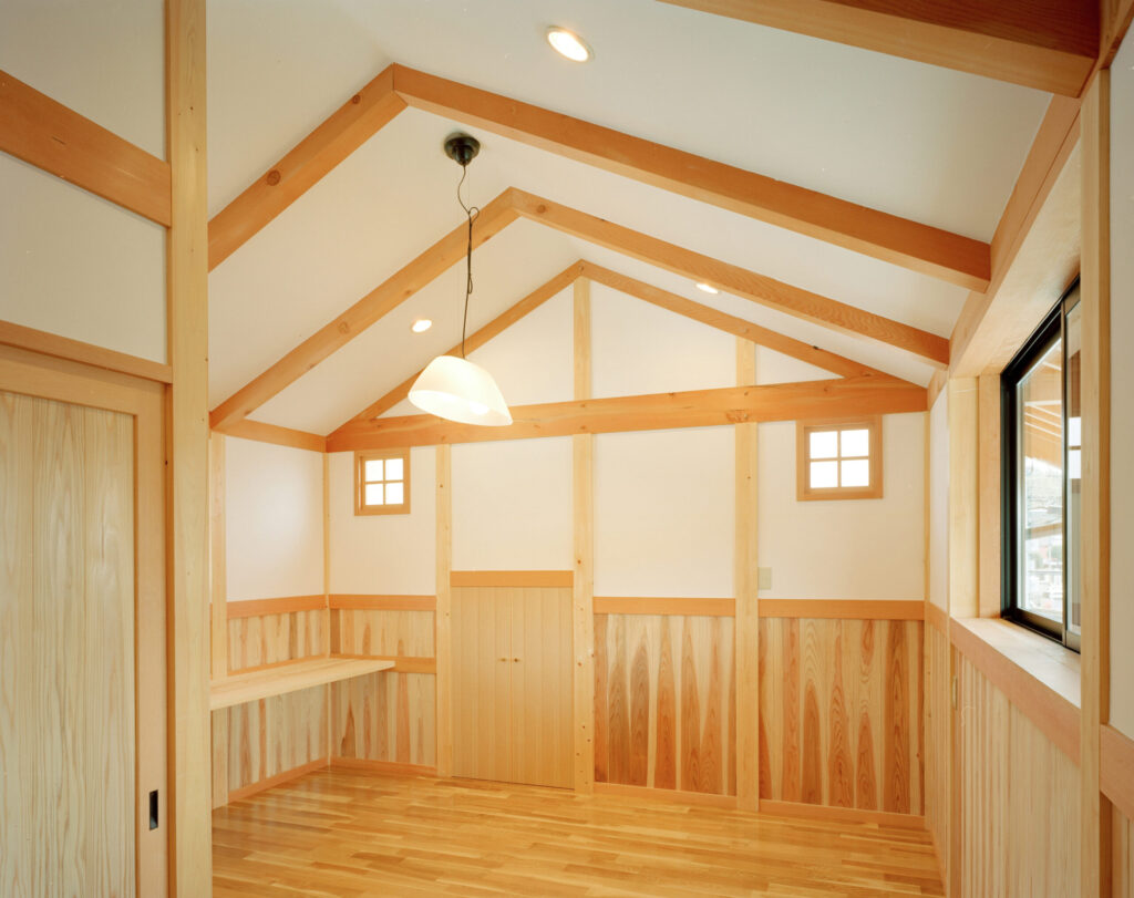 真壁造りとし、材木は構造材から床に至るまで全て無垢材、壁は昔ながらの竹小舞、土壁、漆喰、土壁中塗りで造りました。